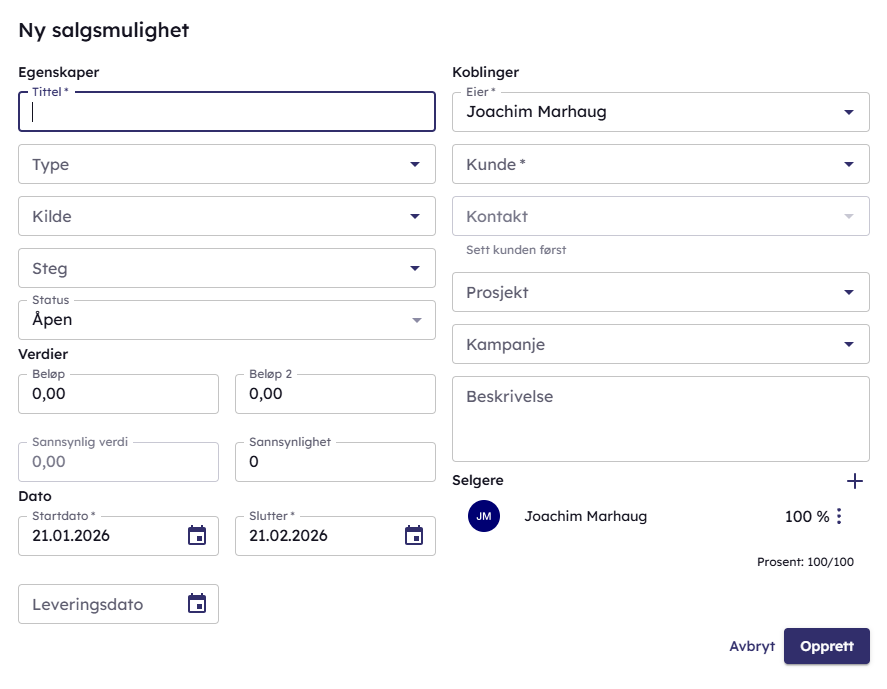 Klikk på "Ny salgsmulighet" øverst til høyre. I dette avsnittet går vi gjennom hvilke felter som kan fylles ut i registreringsskjemaet og hvordan de brukes.