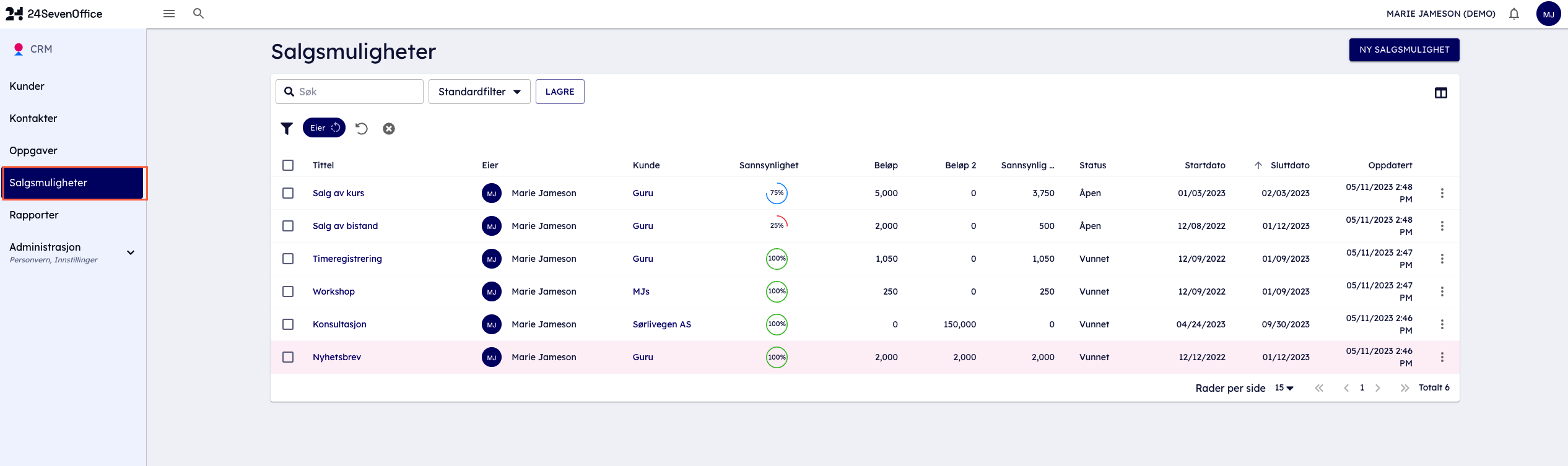 Du kan få tilgang til alle registrerte salgsmuligheter ved å klikke på "Salgsmuligheter" i venstremenyen inne i CRM.