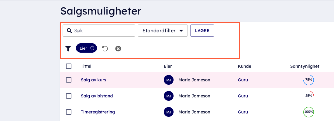 Du kan også lagre ulike filtersøk, du kan lese mer om hvordan du lagrer filtersøk CRM