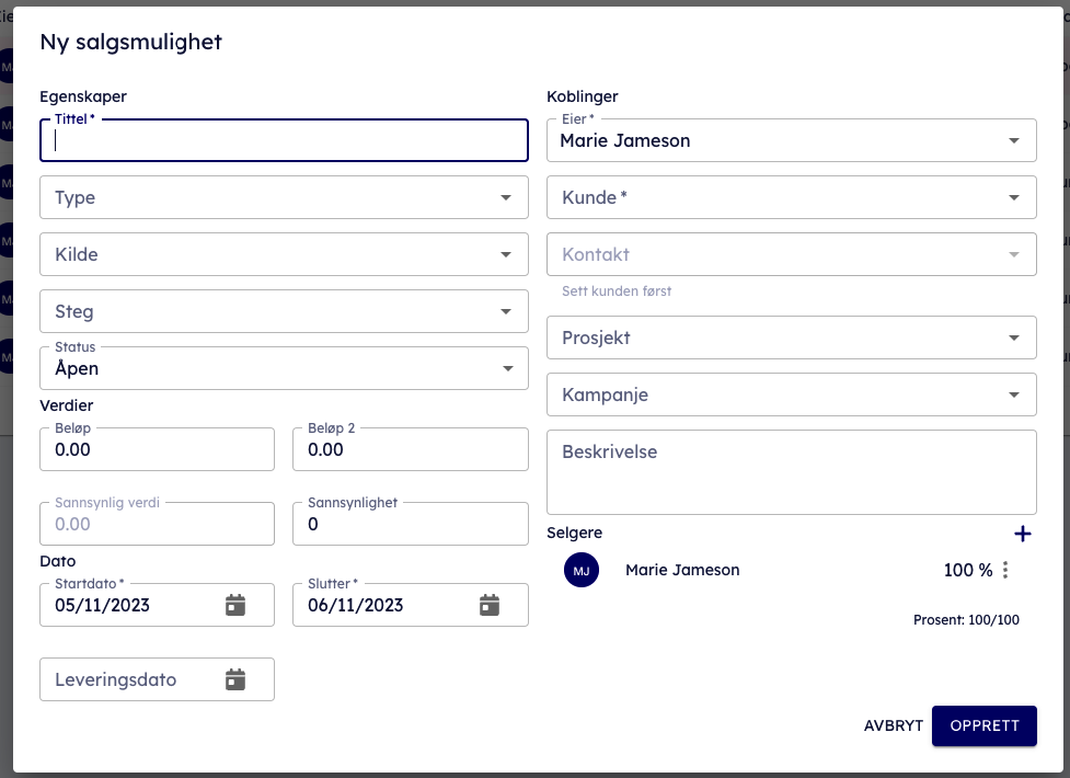 - Eier: Her kan du definere hvem som eier salgsmuligheten