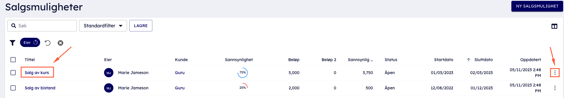 Du kan enkelt endre en salgsmulighet ved å trykke på selve salgsmuligheten du ønsker å endre og deretter trykk på "Lagre". Alternativt kan du klikke på de tre prikkene til høyre på selve oppgaven og deretter trykke "Endre".