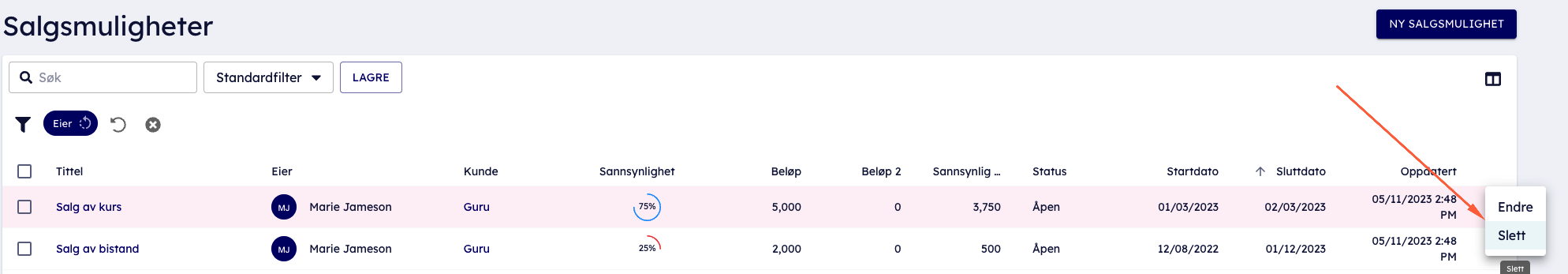 For å slette en salgsmulighet, kan du enten klikke på de tre prikkene til høyre på selve salgsmuligheten og velge "slett", eller så kan du slette flere salgsmuligheter samtidig ved å markere boksen helt til venstre på alle salgs mulighetene du ønsker å slette. Deretter klikker du på søppelkasse-ikonet for å slette dem.