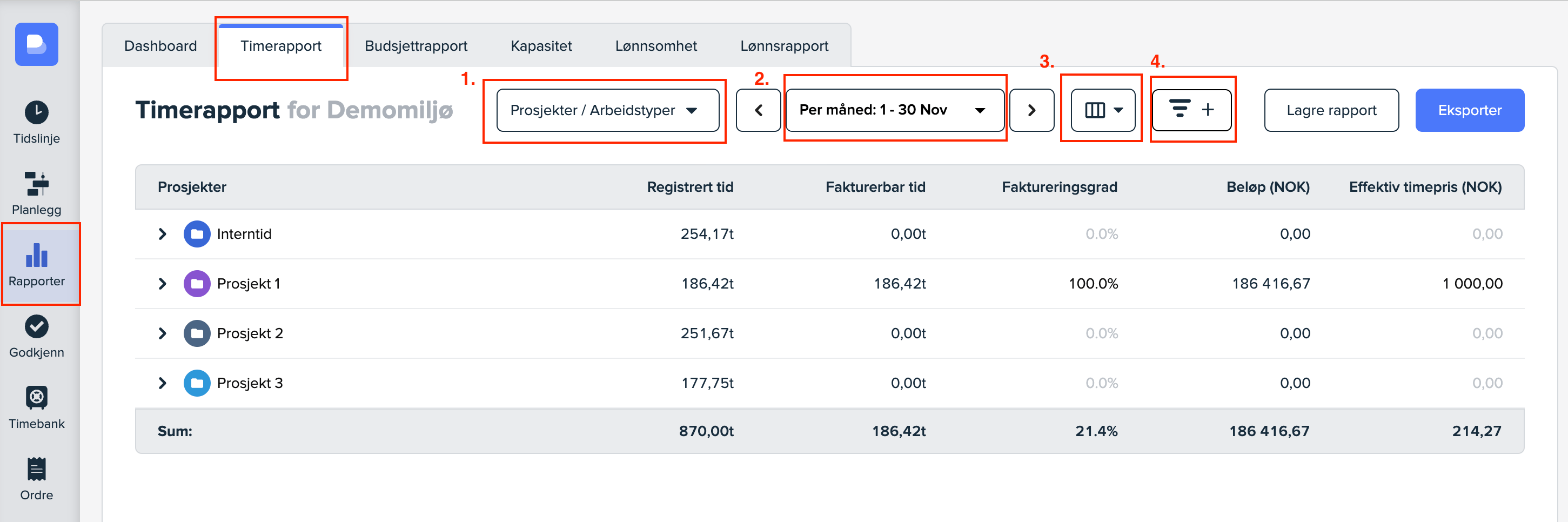 Her er det mange ulike filtre og grupperinger du kan tilpasse for å få den rapporten du trenger. Det er her mulig å gruppere timerapporten etter grupper og undergrupper (1), endre tidsperspektiv (2), velge kolonner som skal være med (3), og legge til ulike filtre for hva som skal vises (4).