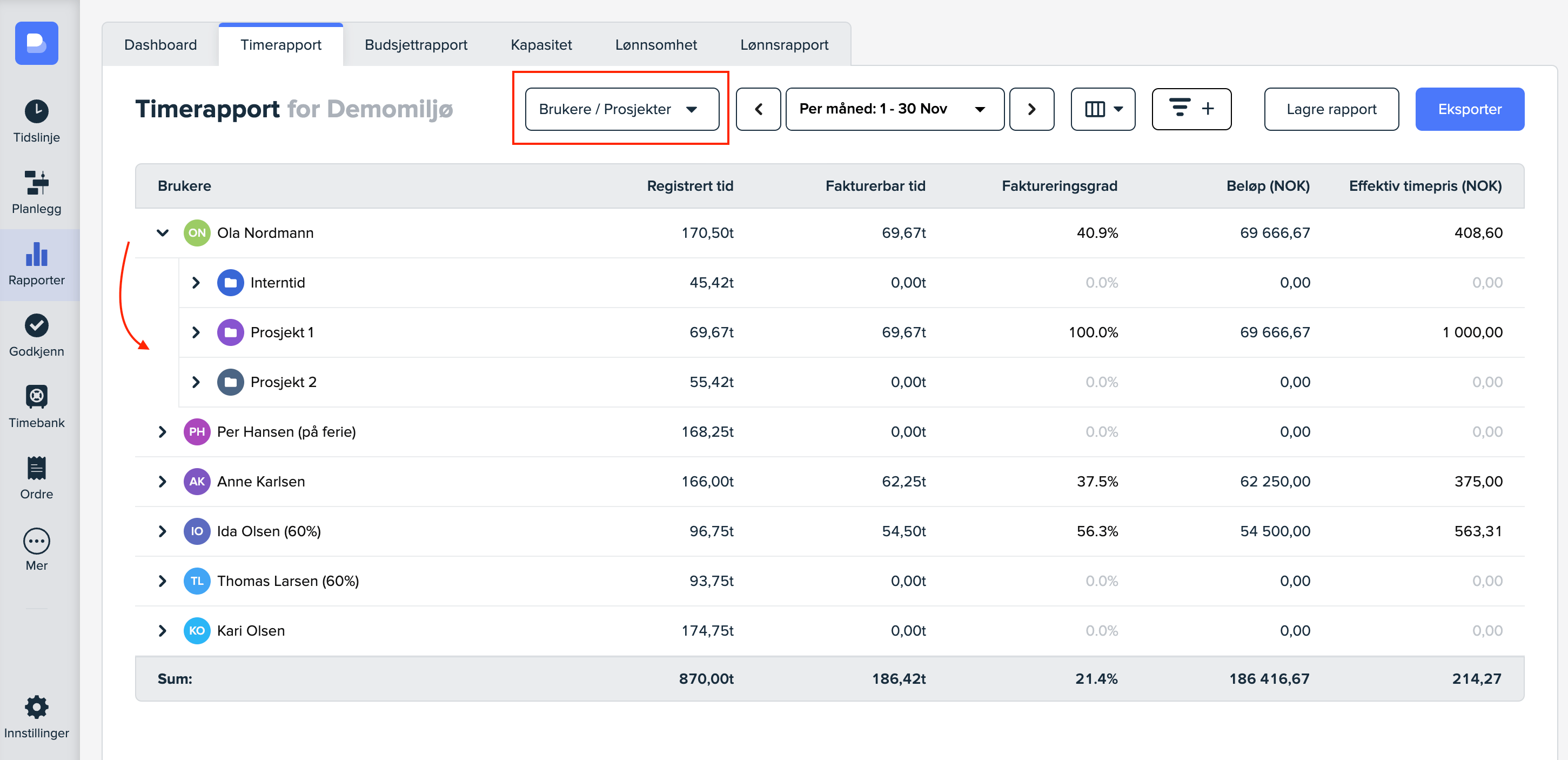 Grupperingsfilteret lar deg bestemme visningen for rapporten, basert på gruppe og undergruppe. Ved å velge «Brukere / Prosjekter» som gruppering og undergruppering vil rapporten se slik ut: