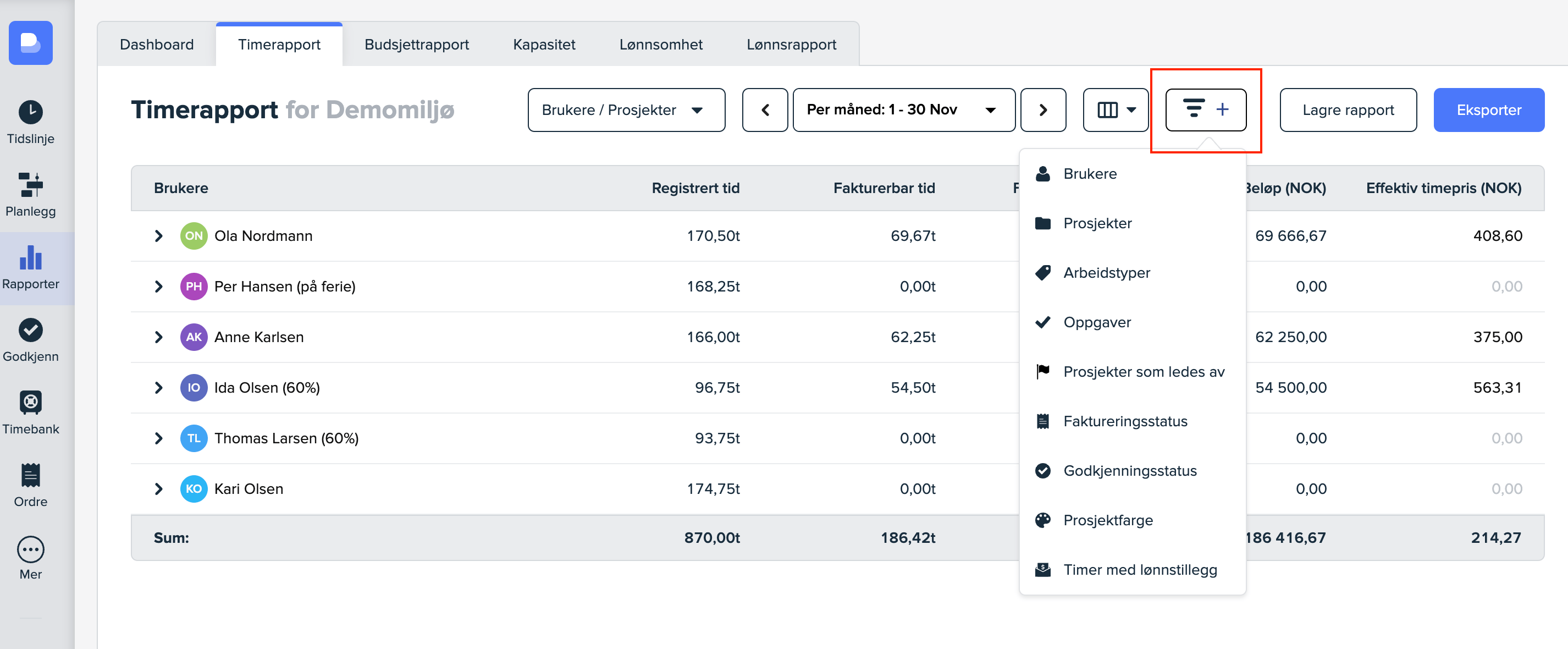 Her får du opp mange ulike valgmuligheter for hva timerapporten kan vise. Blant annet kan du velge «Prosjekter» eller «Arbeidstyper» for å filtrere ut prosjektene og arbeidstypene du ikke har behov for å se i rapporten. Andre nyttige filtre er blant annet «Faktureringsstatus» og «Godkjenningsstatus», hvor du kan filtrere ut prosjekter og timer som allerede er fakturert elle godkjent. Her er det bare å prøve seg fram etter egne behov!
