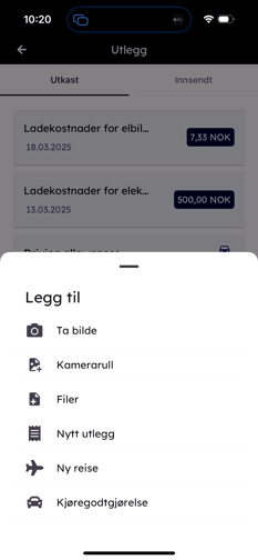 Du får nå muligheten til å: Ta bilde av din kvittering, laste opp kvittering fra din mobils Kamerarull eller Filer, opprette et nytt tomt utlegg (uten å ta bilde først), opprette en ny reise (samling av utlegg fra en reise), og legge til en kjøring.
