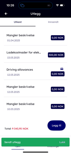 4. Ved å trykke på neste, kommer du til en oppsummering av utlegget ditt. Her får du mulighet til å legge til flere utlegg under samme innsending hvis du ønsker å sende det inn som en bundt. Hvis utlegget ditt er del av en forretningsreise kan du også gjøre om utlegget til en reise. Da må du også fylle inn formål og fra/til-datoer.