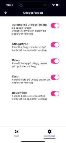 🤖 24SevenOffice Economy benytter både tekstgjenkjenning og AI for å gjøre det så enkelt som mulig å sende inn dine utlegg. Når du oppretter et nytt utlegg via "Ta bilde", "Kamerarull" eller "Filer" betyr dette at systemet automatisk fyller inn forslag til Utleggstype, beskrivelse, dato og beløp. Det er viktig at du selv ser over alle felt før innsendelse. Hvis du ønsker å skru av automatiske forslag for en eller flere av feltene kan dette enkelt gjøres under