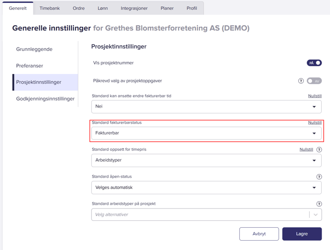 I Busy kan man velge om prosjekter skal være fakturerbare eller ikke-fakturerbare. Vi anbefaler at kundeprosjekter står som fakturerbare, mens man har et (eller flere) interntidsprosjekt(er) som står som ikke-fakturerbare.