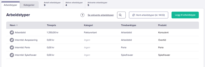 Ved oppsett av arbeidstyper står man i utgangspunktet fritt til å lage de arbeidstypene man selv ønsker, og kan lage så mange man ønsker. Vår generelle anbefaling er likevel å gjøre det så enkelt som mulig.