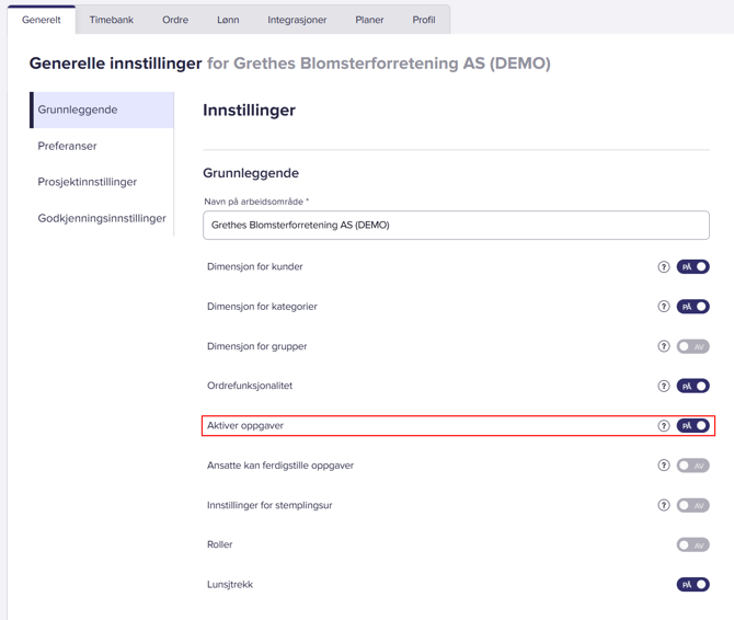 Dersom dere har vært vandt til å arbeide med oppgaver fra tidligere, eller liker å gå i dybden på prosjekter, kan oppgaver aktiveres i Finago Busy. Da vil man måtte føre tid på både en arbeidstype og en oppgave. Dersom man for eksempel ønsker å dele opp et spesifikt prosjekt i flere faser, eller har behov for å tildele oppgaver med tidsestimat til spesifikke brukere, kan oppgaver være nyttig.