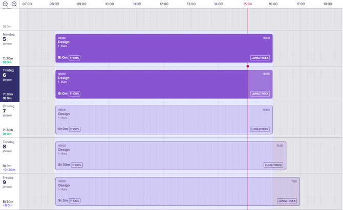 Tidslinjen kan enten være tom, dersom man ikke planlegger fram i tid, eller være fylt med timeføringer og planlagt tid. Har man koblet til kalenderen sin vil også kalenderhendelser kunne være lagt inn her. Den ansatte vil kort fortalt få et godt og detaljert overblikk over hvordan uken og dagene ser ut.