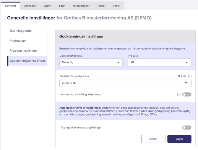 Under «Generelle innstillinger» kan du velge om du vil ha godkjenningsflyten satt til hver måned eller hver uke. Hver måned vil bety mindre administrativt arbeid, så det bør velges der det er mulig. Hvis man sliter med at ansatte ikke fører timer, og ønsker bedre kontroll, kan ukentlig godkjenning være det beste.