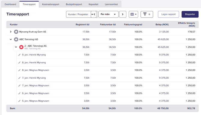 Vi anbefaler generelt å gjøre seg godt kjent med timerapporten, da dette er en «mektig» rapport som gir all informasjon om timer. I denne rapporten kan man filtrere ut spesifikke elementer, gruppere og undergruppere, lagre rapporten og eksportere den.
