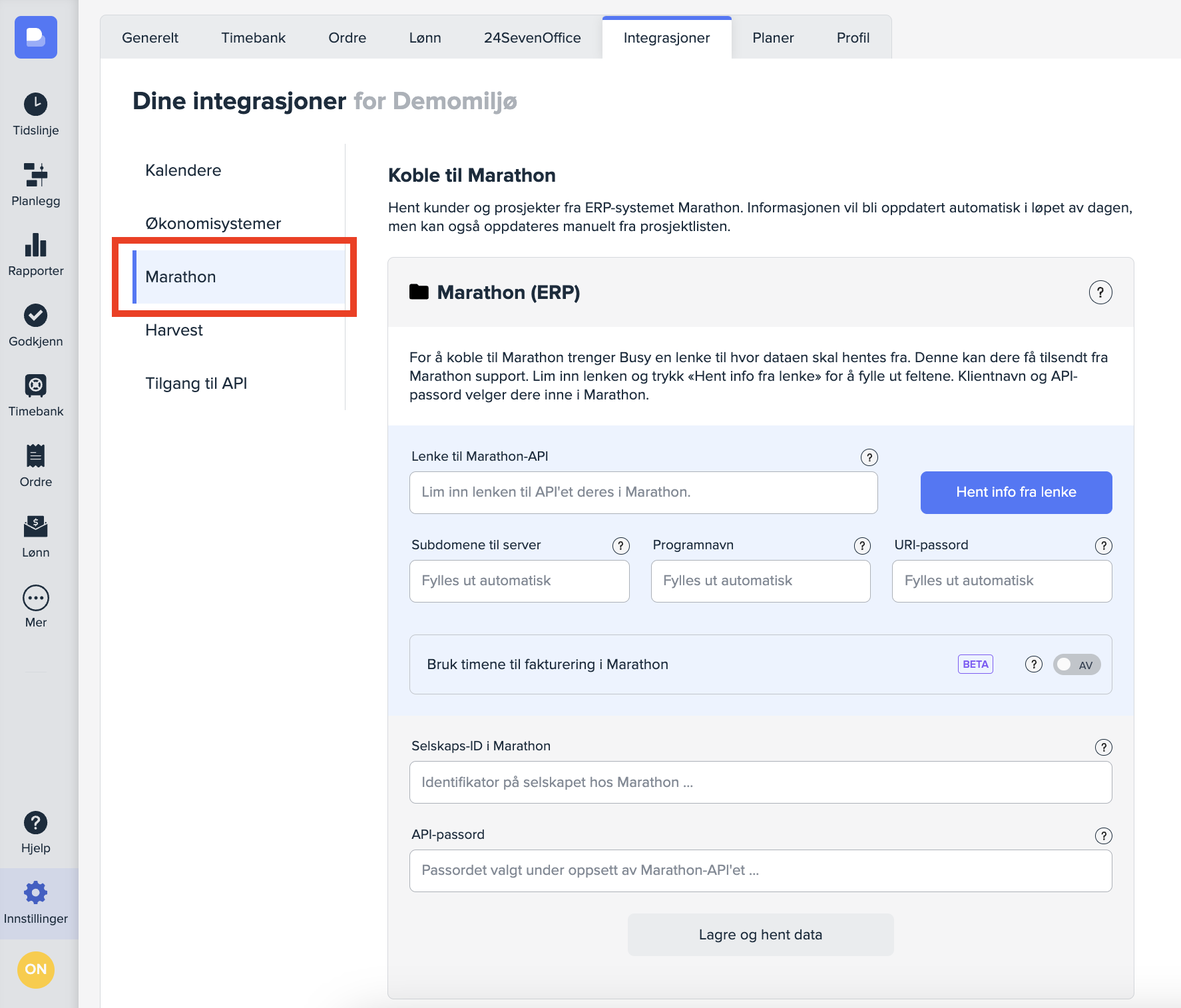 Til slutt fyller du inn navn på selskapet du skal koble til, og passordet du fikk tilsendt av Marathon. Trykk «Lagre og hent data» for å koble opp integrasjonen!