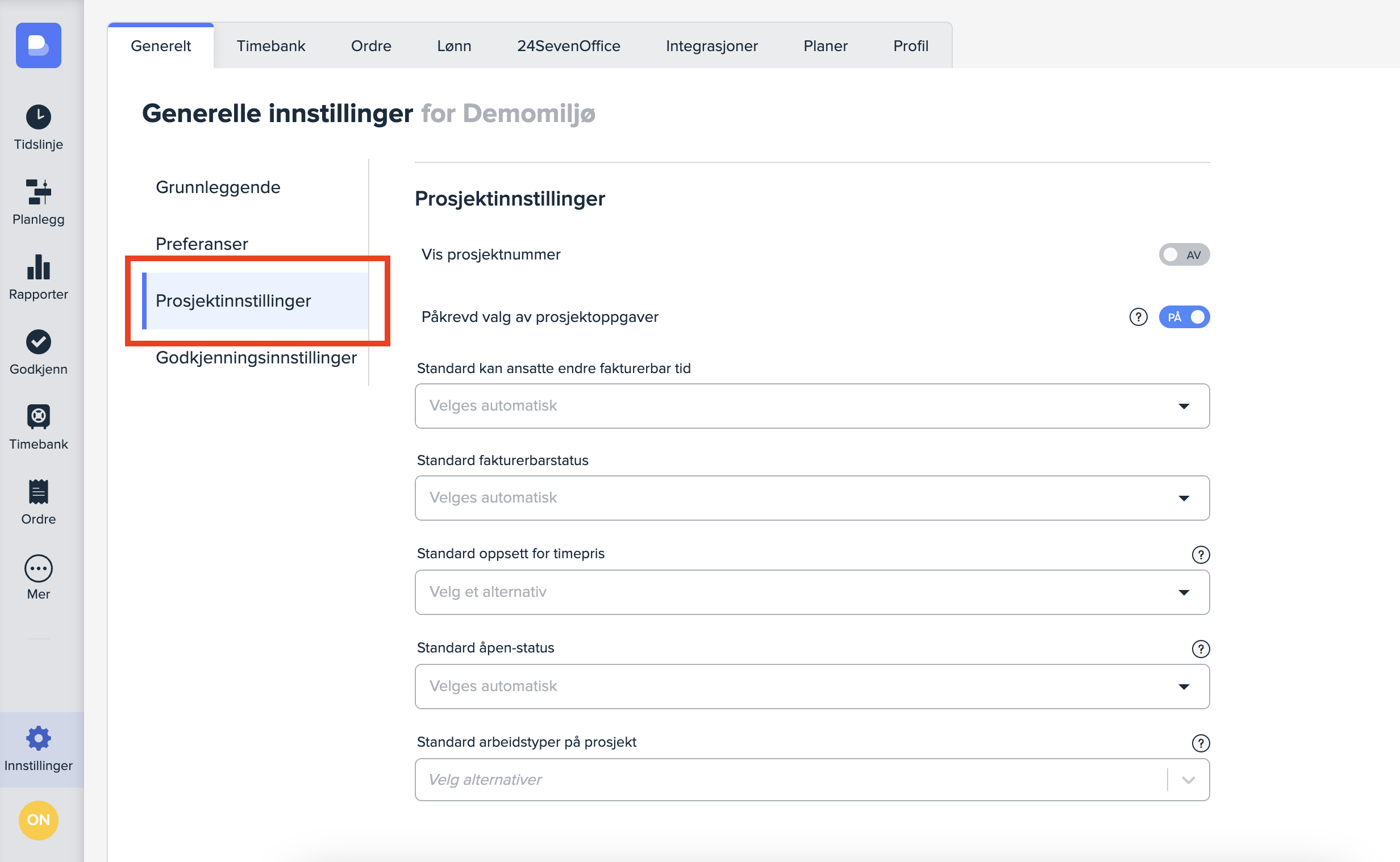 Ønsker dere andre standard verdier enn det som settes automatisk på nye prosjekter fra Marathon er det anbefalt å velge dette fra generelle innstillinger. Det er spesielt anbefalt å sette nye prosjekter standard som åpne for at alle skal kunne føre timer på de.