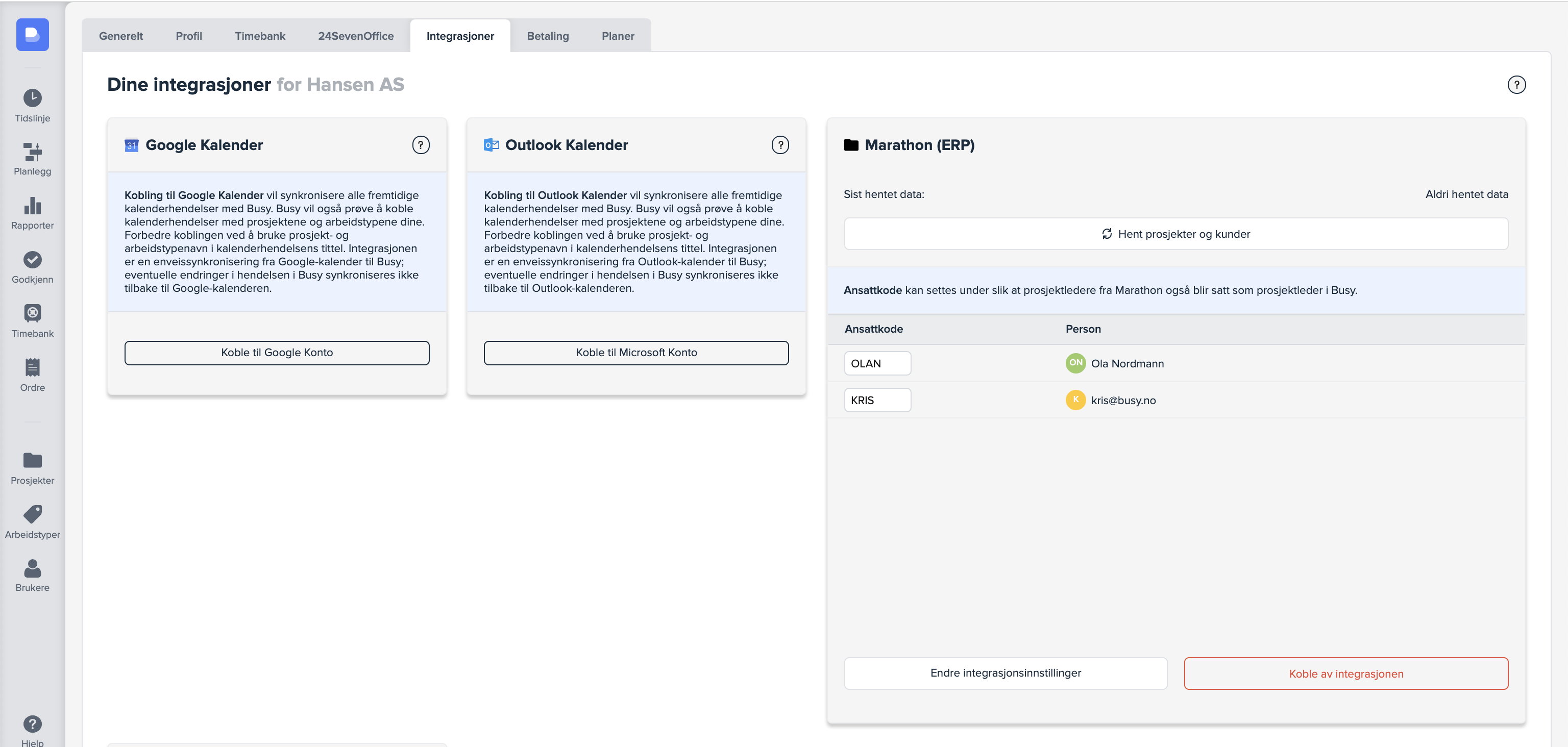 Dette innebærer at om dere har lagt til brukere på prosjektene i Marathon vil brukerne automatisk synkroniseres inn som medlemmer i Busy.