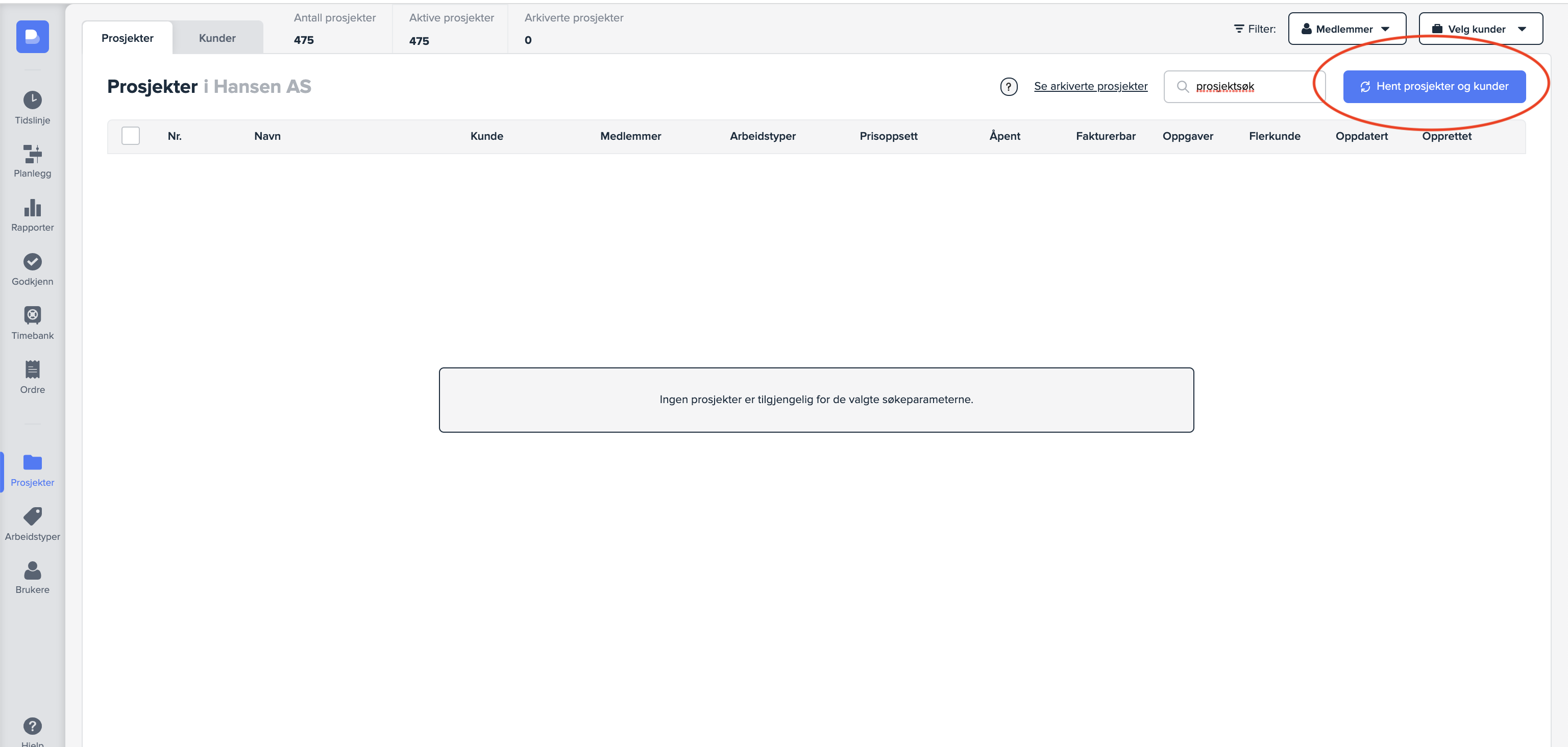 Fra nå opprettes alle prosjekter, kunder og arbeidstyper fra Marathon. De hentes inn i Busy automatisk en gang i timen, men du kan alltids oppdatere manuelt ved å trykke «Hent prosjekter og kunder» i prosjektlisten. Da vil prosjekter, kunder og eventuelt arbeidstyper hentes umiddelbart. Dere kan også trigge en synk direkte fra integrasjonssiden hvor dere satte opp integrasjonen.