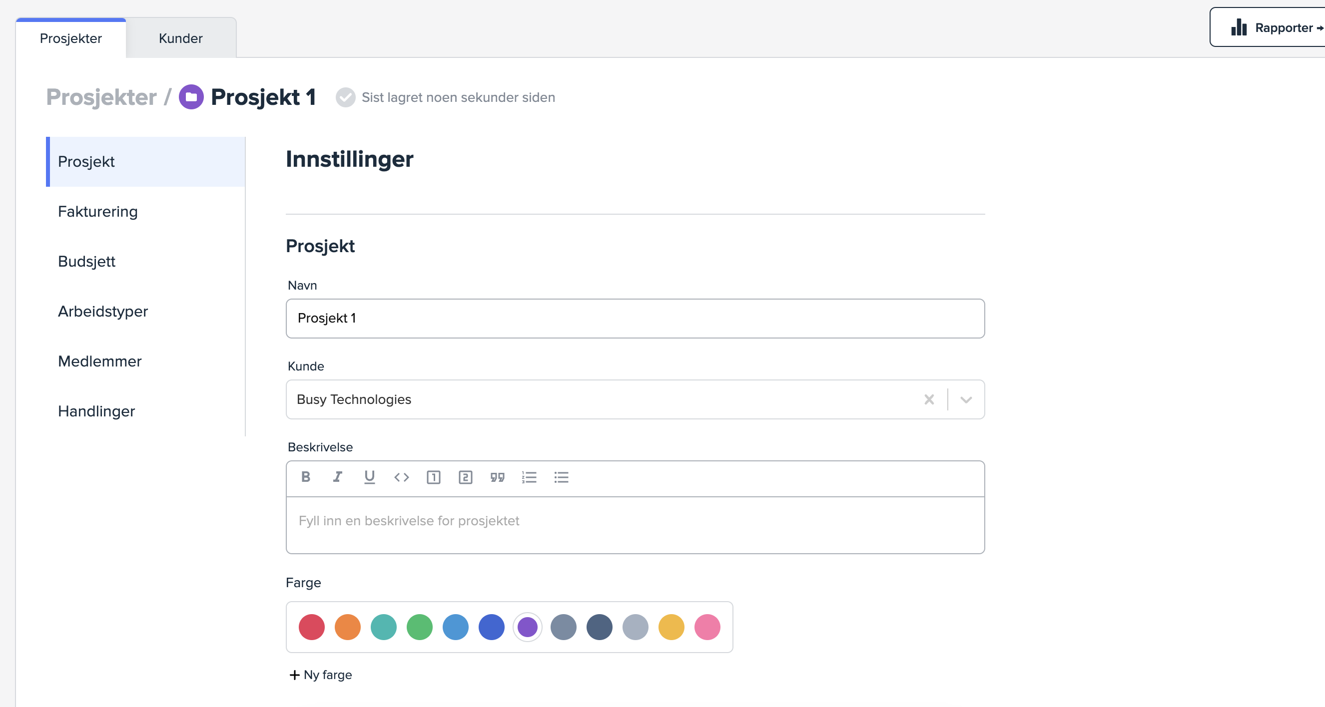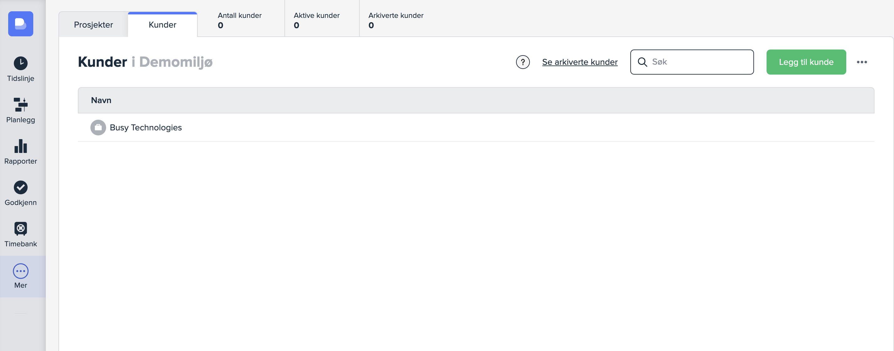 Aktive kunder koblet til et prosjekt vil bli synkronisert inn i Busy og ligge i kundelisten under «Mer» -> «Prosjekter» -> «Kunder».