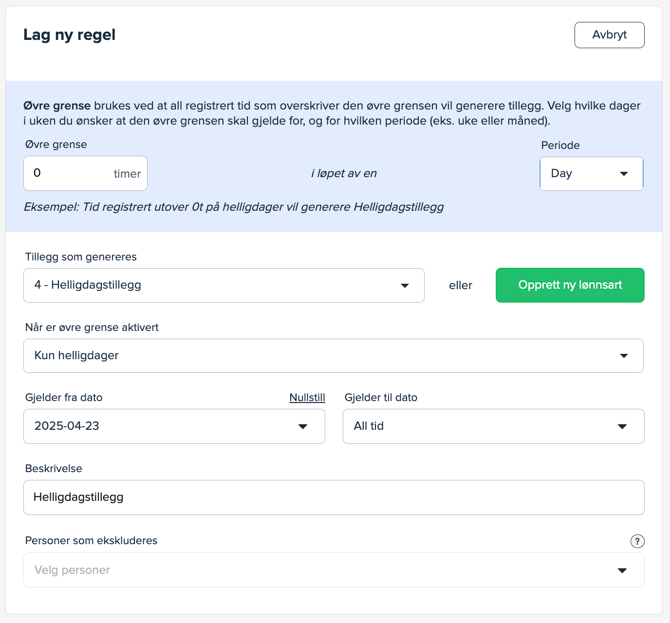 Periode er automatisk satt som dag, slik at tid ført over den øvre grensen på en hver helligdag vil generere tillegg med overtidsregelen. Du kan overstyre den øvre grensen om du ønsker.