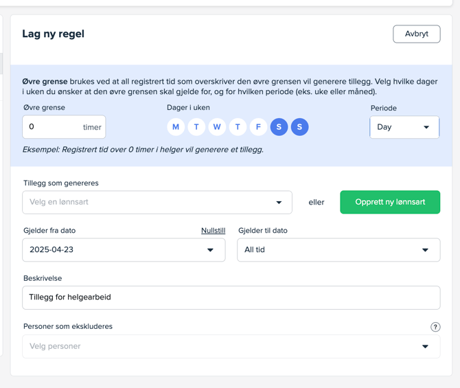 Velg på samme vis som tidligere hvilket tillegg som skal genereres (lønnsart), fra - til dato, beskrivelse og eventuelt personer som skal ekskluderes fra regelen.