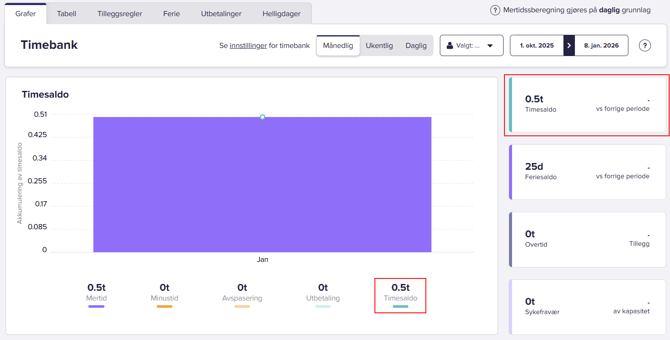Her kan du se alles timesaldo, inkludert mertid, minustid og feriesaldo.
