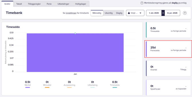 Feriesaldo er et annet viktig tall og viser hvor mye tilgjengelig ferie du har. Ofte starter du med 25 dager ferie. Når du registrerer tid på tidslinjen vil antall feriedager reduseres. Du kan lese mer om registrering og oppsett av ferie i vårt hjelpesenter. Du kan se utviklingen av ferie i vår graf for feriesaldo. Merk at en gang i året får du lagt til et gitt antall feriedager, gjerne basert på stillingsprosenten din.
