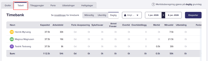 Som administrator har du tilgang til timebanken for hele selskapet. Ved å trykke deg inn på «Tabell» vil du få alle dataene fra timebanken inn i en oversiktlig tabell.