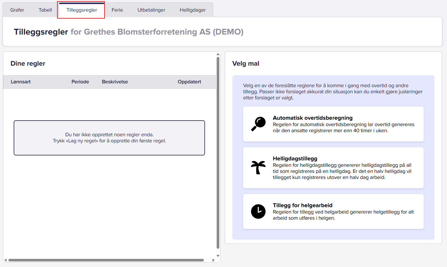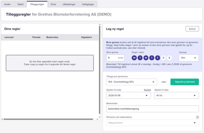 Du kan også opprette andre tillegg, for eksempel reisetillegg eller helgetillegg. Les mer om tilleggsregler her