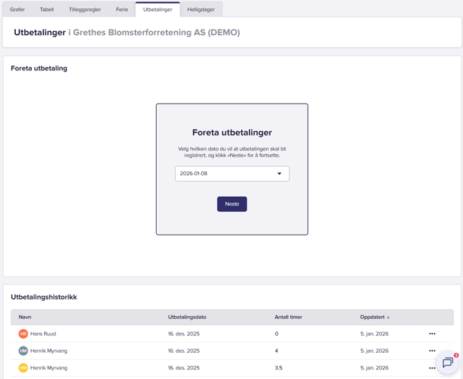 Dersom en eller flere ansatte har flere timer i pluss kan man velge å utbetale timene i lønn istedenfor at den ansatte skal kunne avspasere. En utbetaling vil redusere timesaldoen til den ansatte. Du kommer til utbetalinger ved å trykke på «Utbetalinger» i menyen øverst. Videre velger du hvilken dato du vil at utbetalingen skal bli registrert, og trykker «Neste».