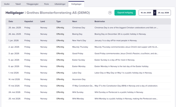 Den siste fanen i timebanken viser en oversikt over helligdagene arbeidsområdet benytter seg av. Ved å trykke på "Opprett helligdag" øverst til høyre får du muligheten til å opprette en ny egen helligdag for selskapet.