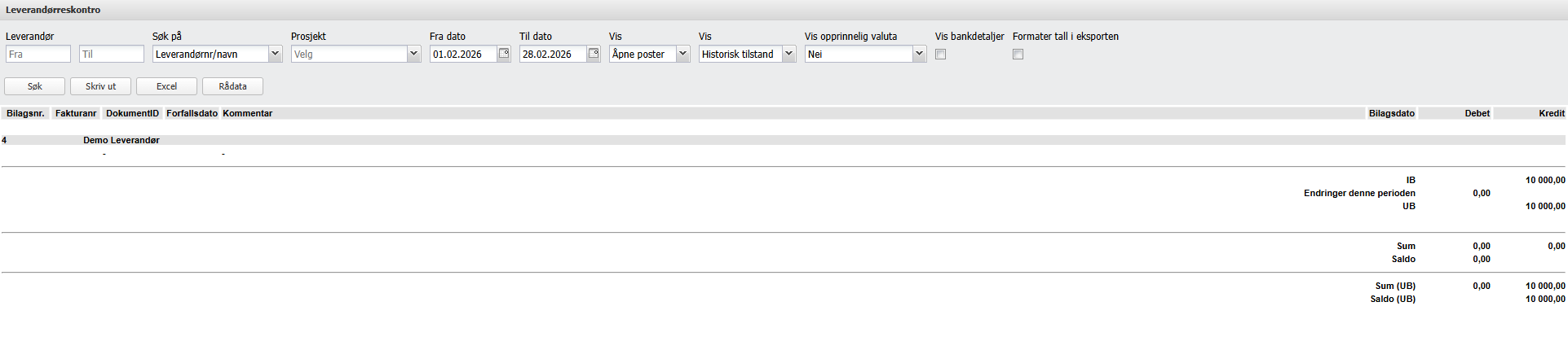 Denne rapporten gir en systematisk oversikt over alle poster som er registrert på leverandørreskontro. Du kan se alle, åpne eller lukkede poster for alle leverandører, per leverandør, eller på gitt dato.