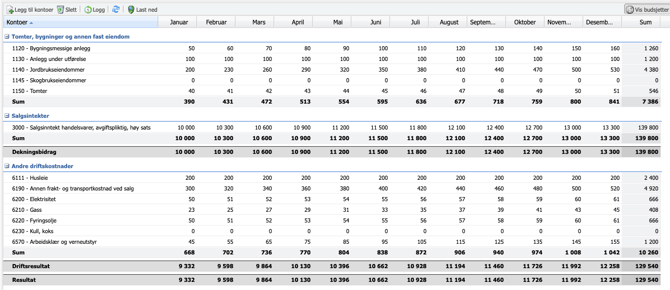 Legg inn tallene for eksempel per måned og årsbudsjettet akkumulerer de innlagte tallene og lager automatisk et årsbudsjett. Både inntekter og utgifter legges inn med positivt fortegn.
