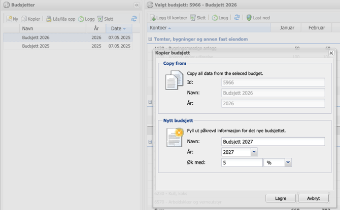 - I dialogboksen som fremkommer kan du skrive inn nytt navn på budsjettet, velge år og eventuelt velge å øke tallene i budsjettet med et visst beløp eller prosentsats.