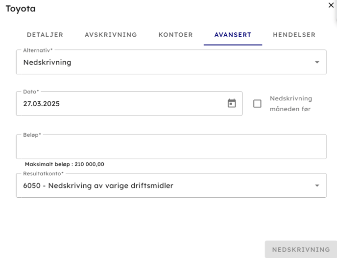 - For eiendelen nedenfor så ser en at for den 27.mars så kan en maksimalt nedskrive 210.000. Kjøpesum for eiendelen var 360.000 og startet januar 2024 med 36 perioder. Per mars 2025 så har den blitt avskrevet 12 + 3 perioder = 150.000. Så hvis en hensyntar Kjøpesum – avskrevet til og med mars 2025 så blir regnestykket 360.000 – 150.000 = 210.000.