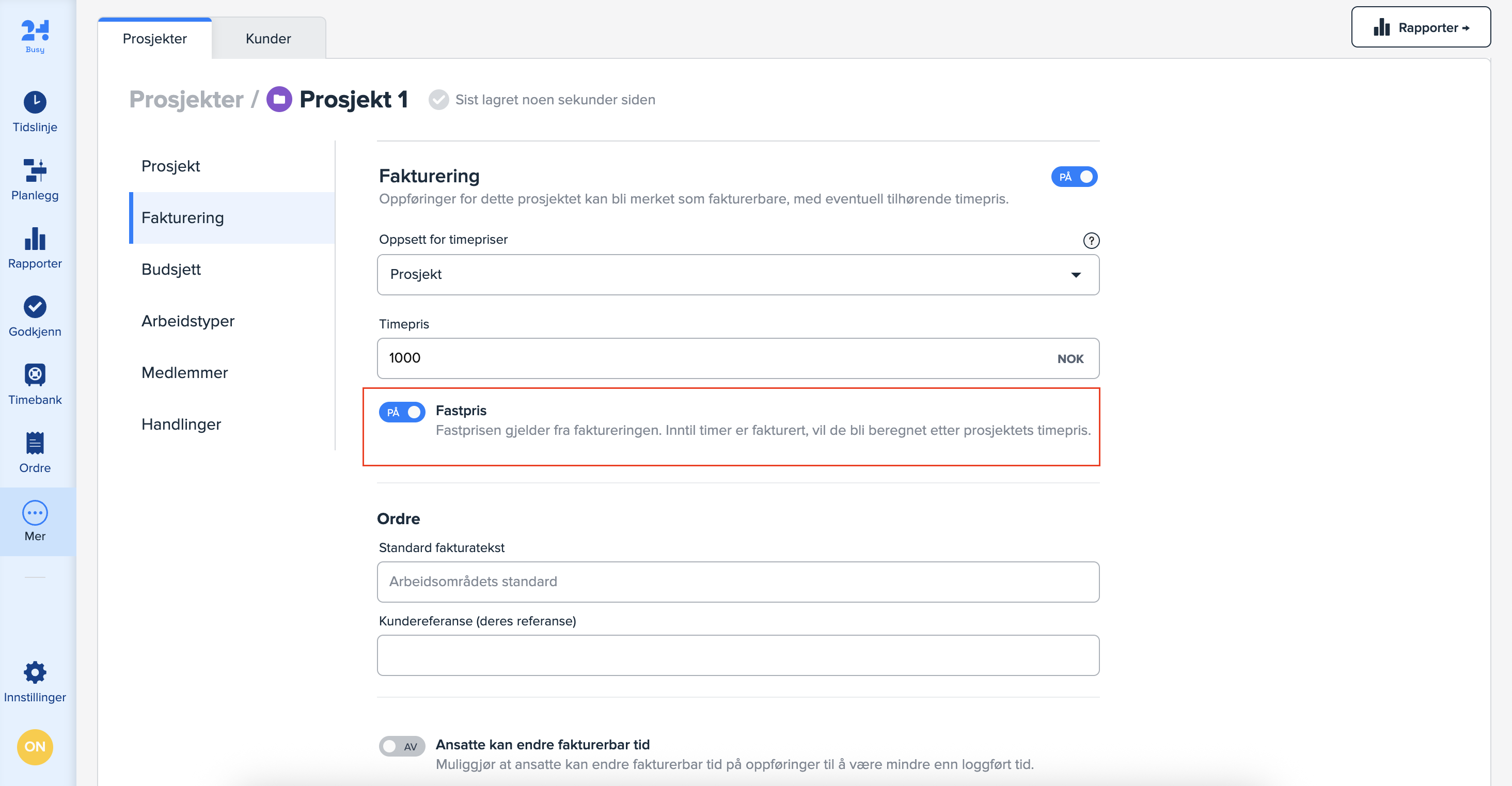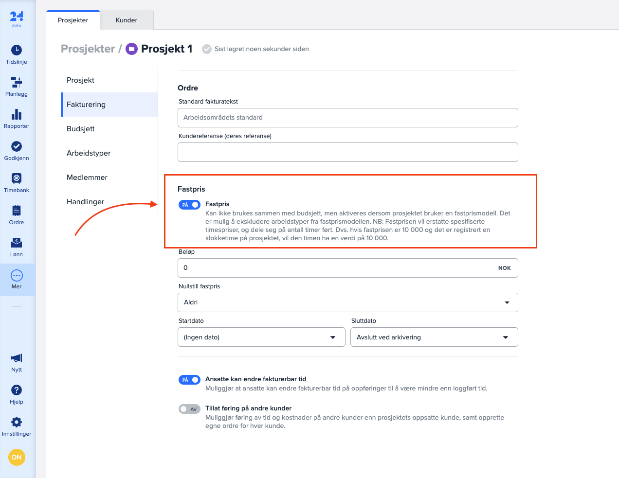 Du finner innstillingen for «Fastpris» under «Fakturering» inne på hvert prosjekt.