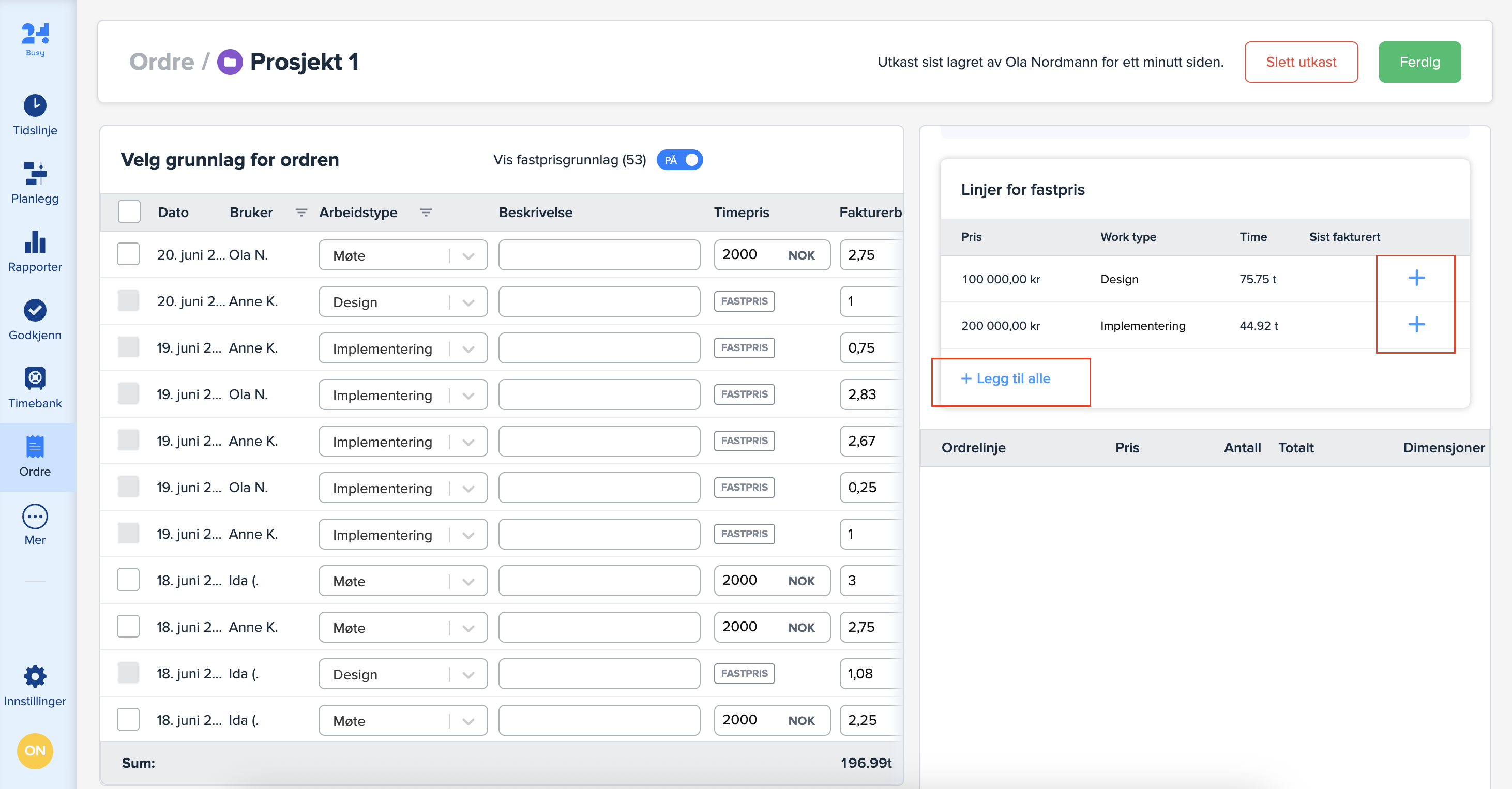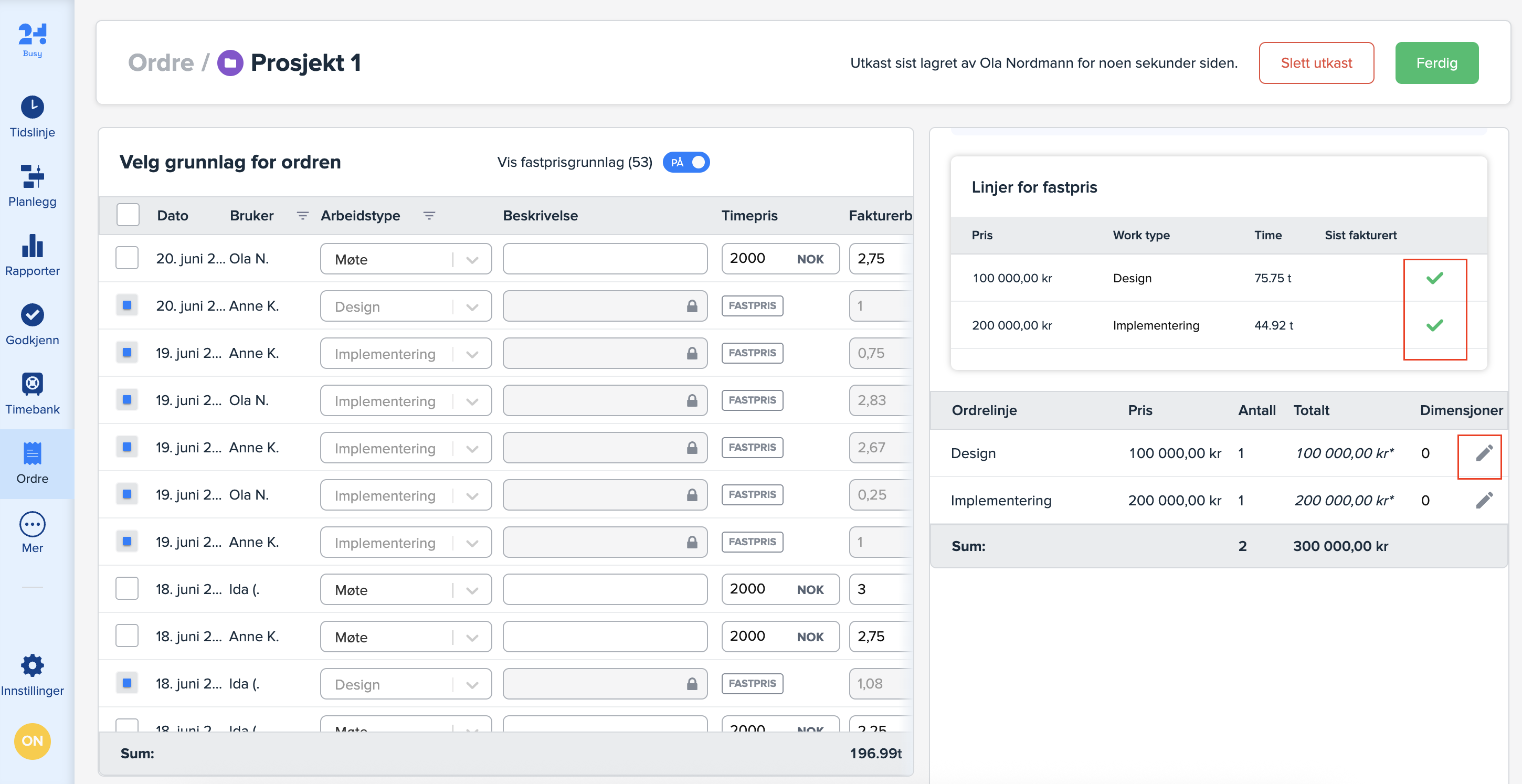 Når du har lagt til ønskede timer og fastprislinjer, klikker du på «Ferdig»-knappen øverst til høyre for å opprette ordren. Du vil få en advarsel hvis det er endringer i timeprisen for timene med fastpris.