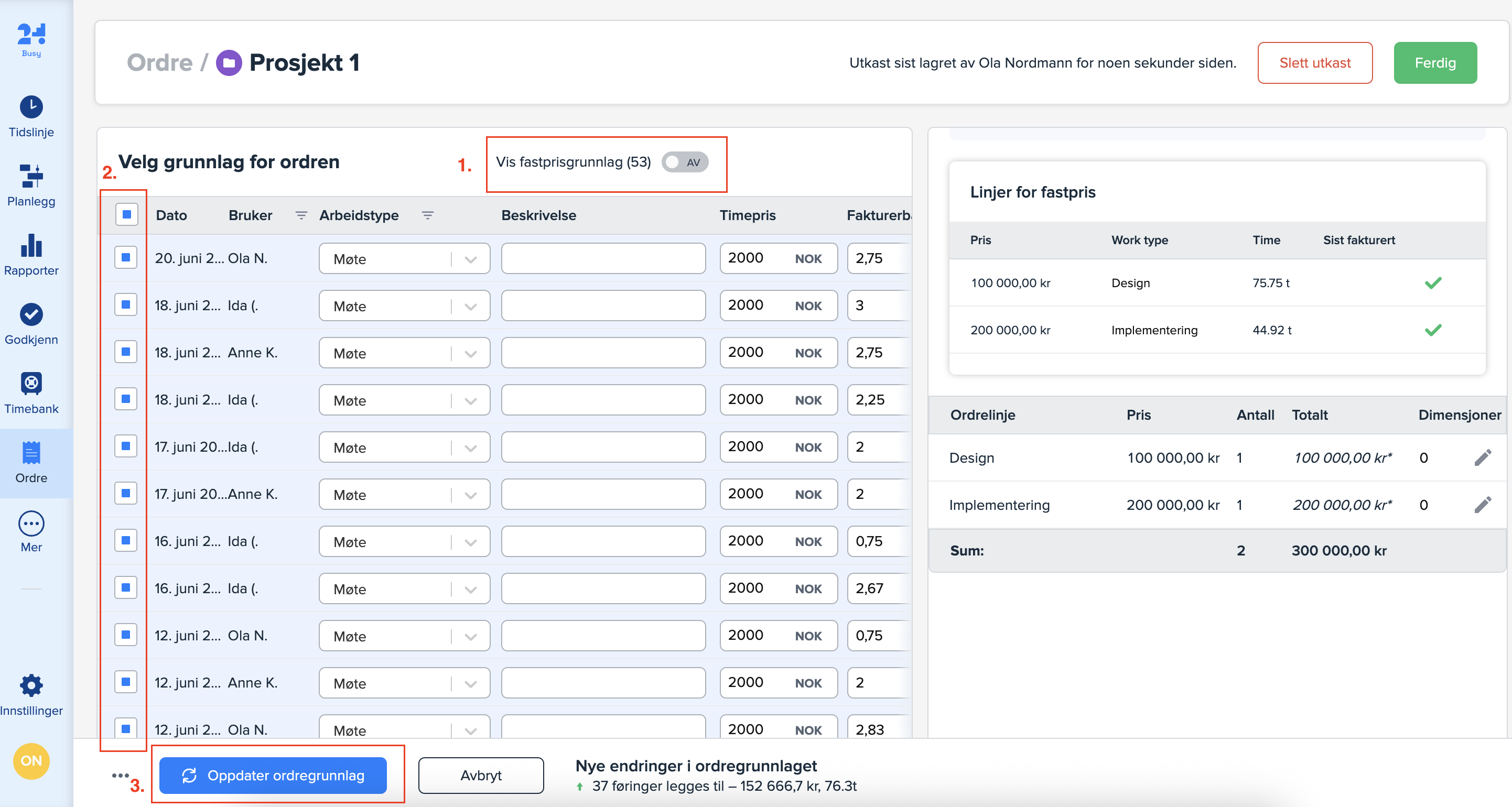 Skru «Vis fastprisgrunnlag» av for å kun se løpende timer (1). Marker timene du ønsker å legge til (2) og trykk på «Oppdater ordregrunnlag» (3) for å legge til timene på ordren.