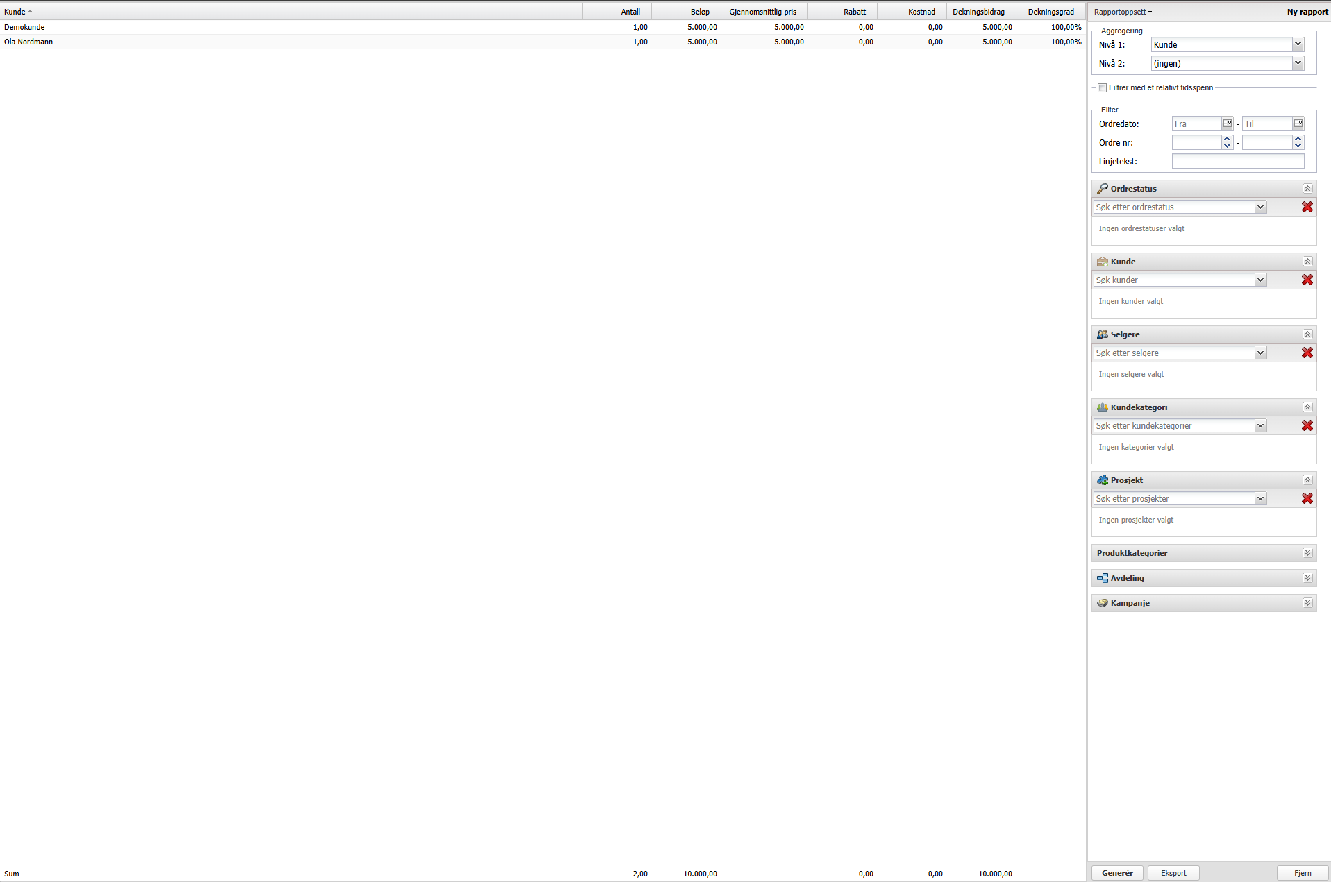 - Du kan søke og filtrere på dato, ordrestatus, kunde, selger, kundekategori, prosjekt, produktkategori, avdeling og kampanje ettersom hva du ønsker å få frem.