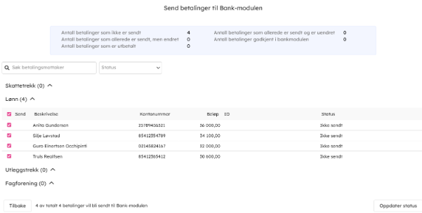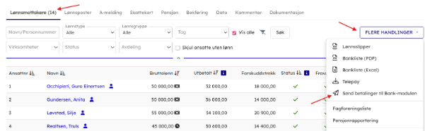 Når man står i Lønnsmottaker fanen i lønnskjøringen, gå til Flere handlinger → Send Betalinger til Bank-modulen