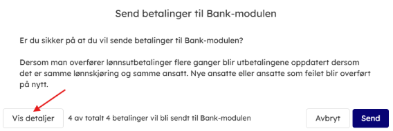 Du får så et nytt vindu som viser antall betalinger som blir overført. Trykker på “Vis detaljer” for å få oversikt over betalingene som overføres.