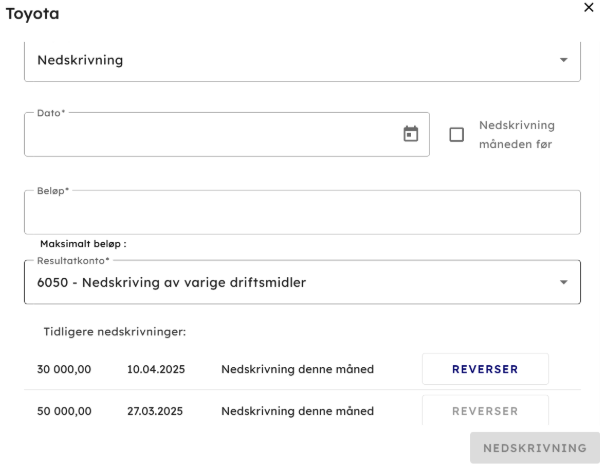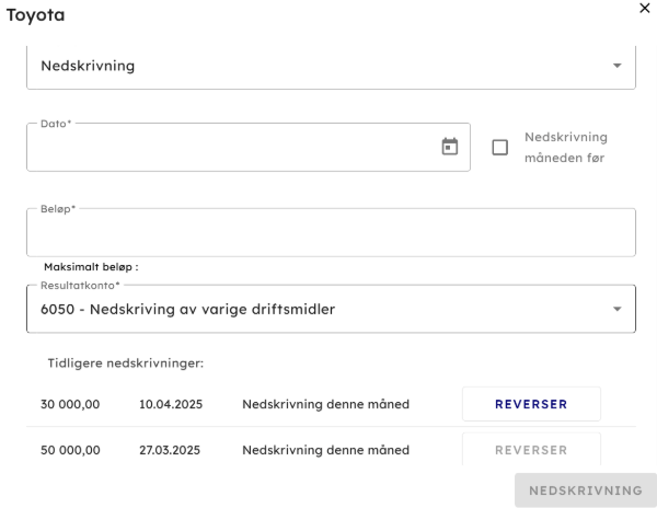 - I listen tidligere nedskrivninger vil en få opp alle nedskrivninger utført på eiendelen, og en får kun nedskrive den siste nedskrivningen, altså den som er utført sist. Så hvis en har utført 3 nedskrivninger og trenger å reversere den første som ble gjort så må du i 3 omganger reversere hver nedskrivning. Dette gjøres i omganger, for hver omgang må evt reversere avskrivninger som er gjort med et annet beløp enn original avskrivningsbeløp. For hver reversering vil en for hvert steg komme nærmere originalavskrivningsbeløp.