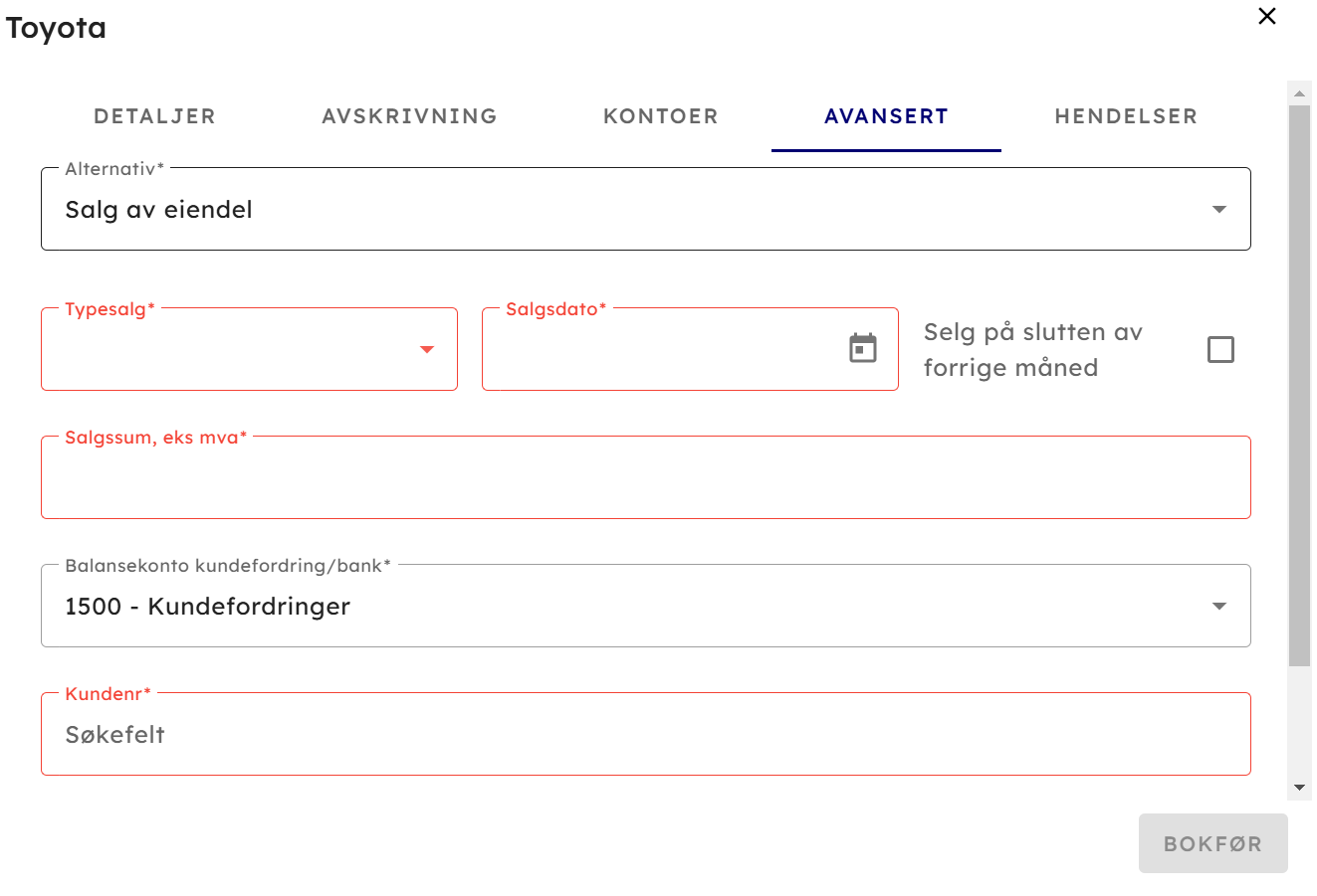 Vår salgsfunksjon gjør at du enkelt kan selge eiendeler, du slipper å tenke på om den er avskrevet til salgstidspunktet eller om du har avskrevet inn i fremtiden for det vil systemet hensynta det eneste du behøver å tenke på er å velge salgsdato, typesalg, salgssum, balansekonto for fordring samt kundenr og checkboxen.