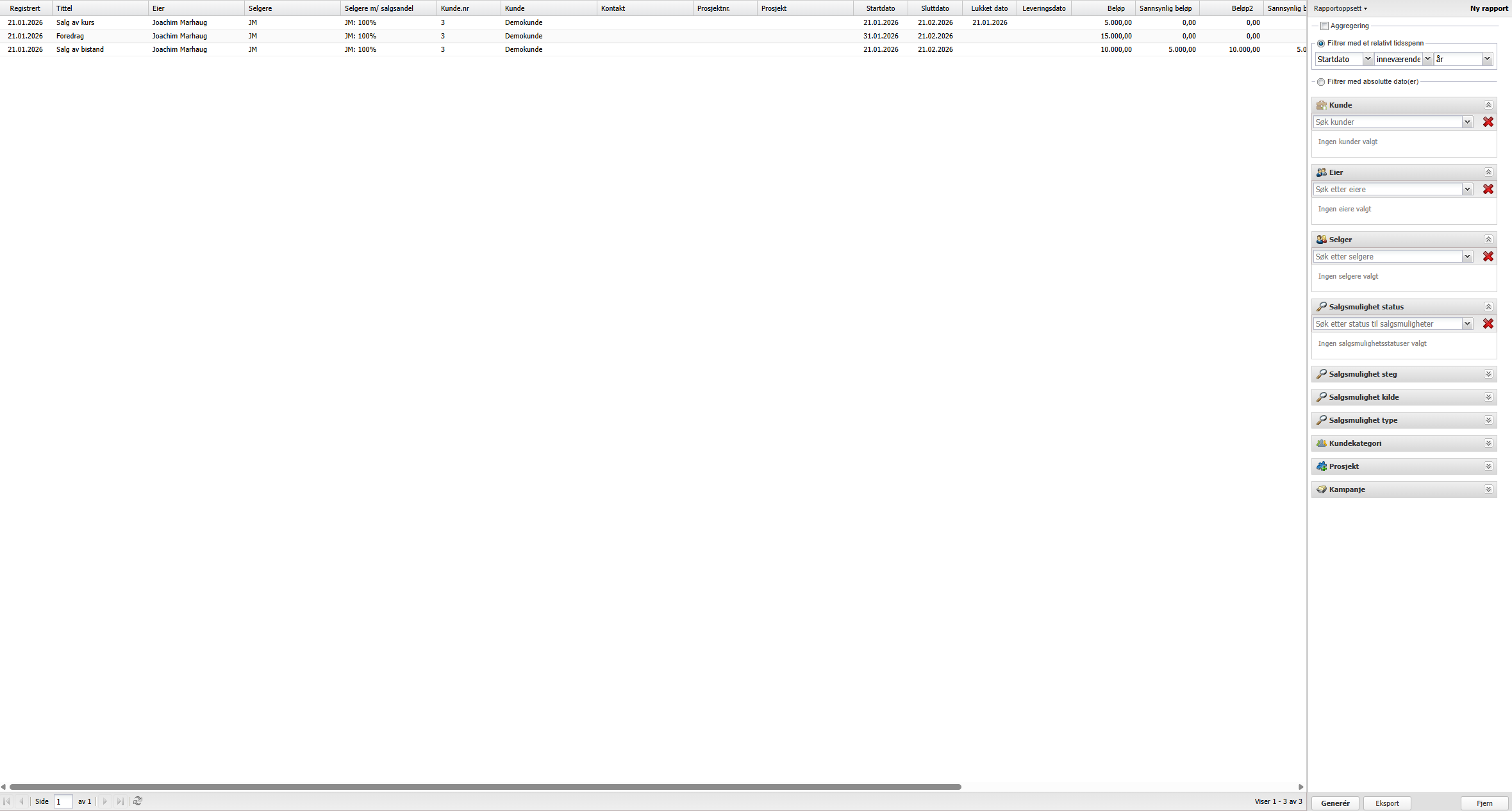 Rapporten viser en oversikt over alle salgsmuligheter.