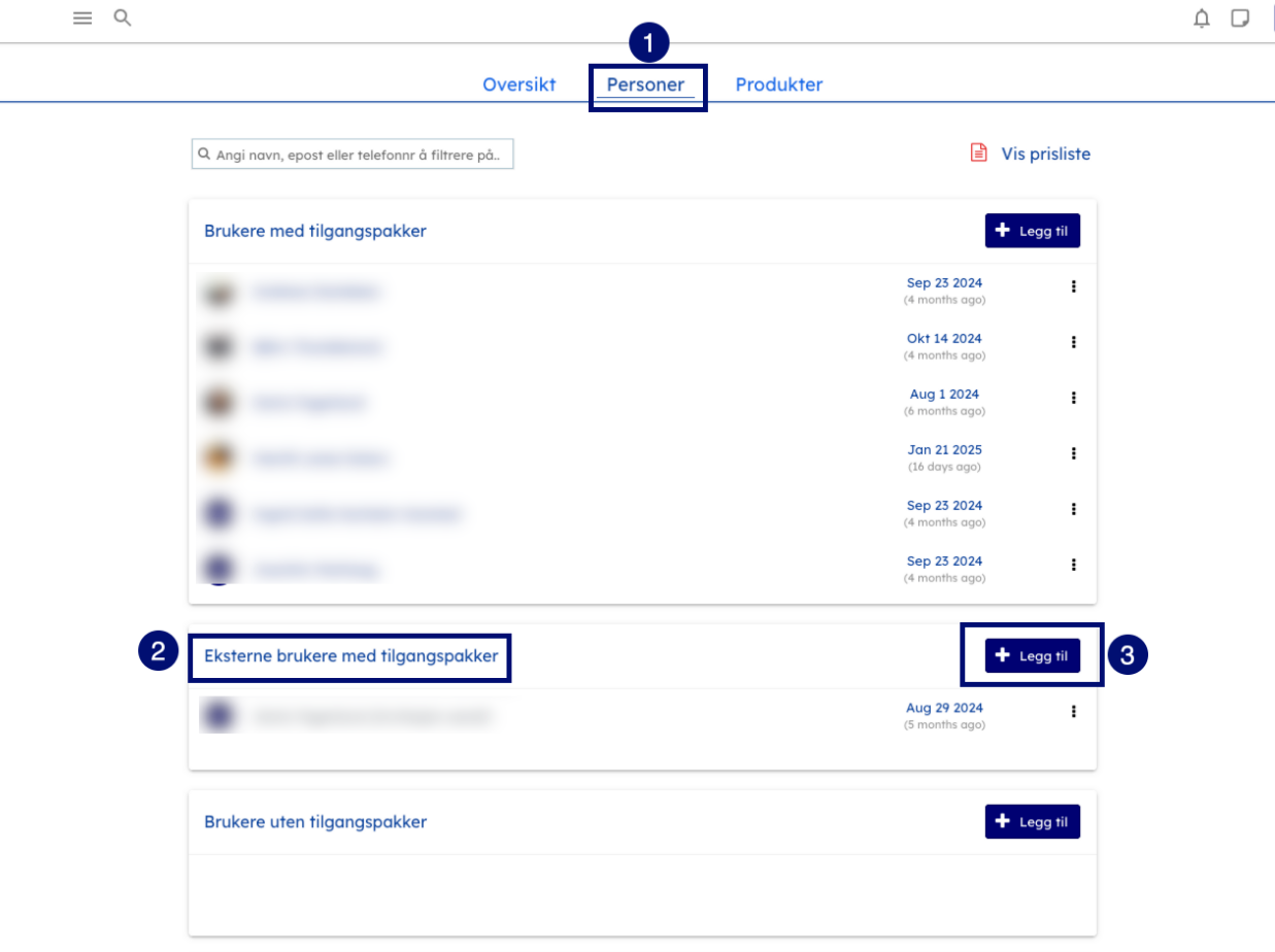 - Finn seksjonen Eksterne brukere med tilgangspakker, og klikk på + Legg til.