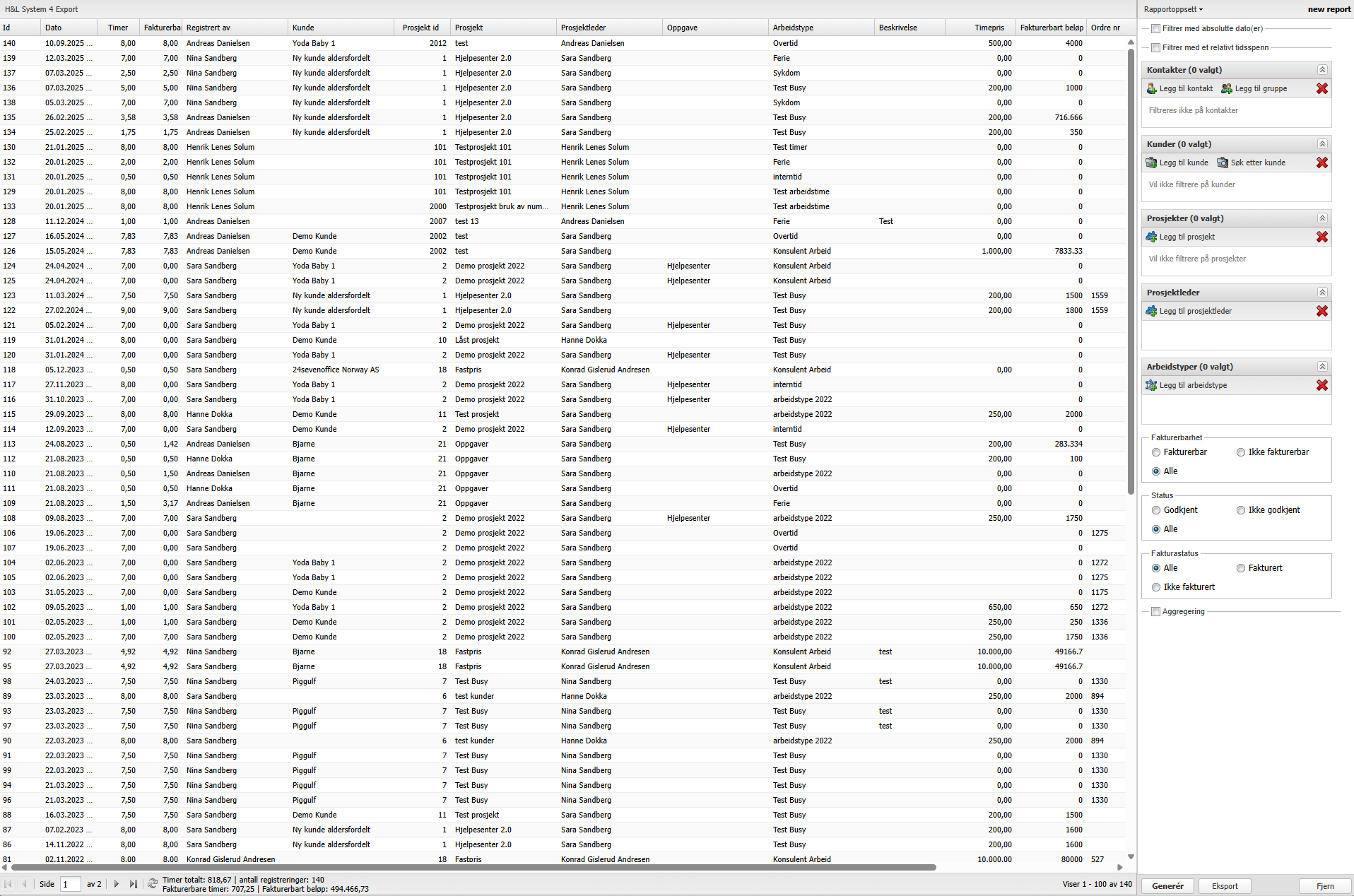 Timerapporten brukes til å hente ut timer på alle ansatte eller en ansatt som har jobbet en periode. Du kan også hente ut timer registrert på et prosjekt. Du får også oversikt over alle timer som er registrert med mulighet for selekteringer.