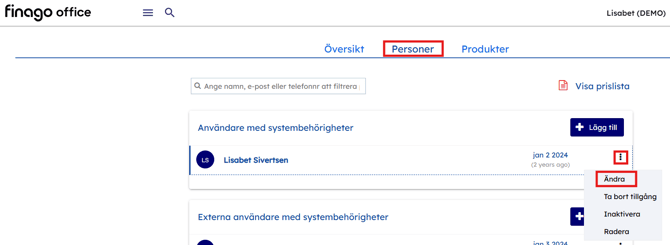 Under fliken Personer hittar du en översikt över de som har åtkomst till din klient. Genom att använda de tre punkterna kan du ändra åtkomst, ta bort åtkomst, inaktivera eller radera användaren.