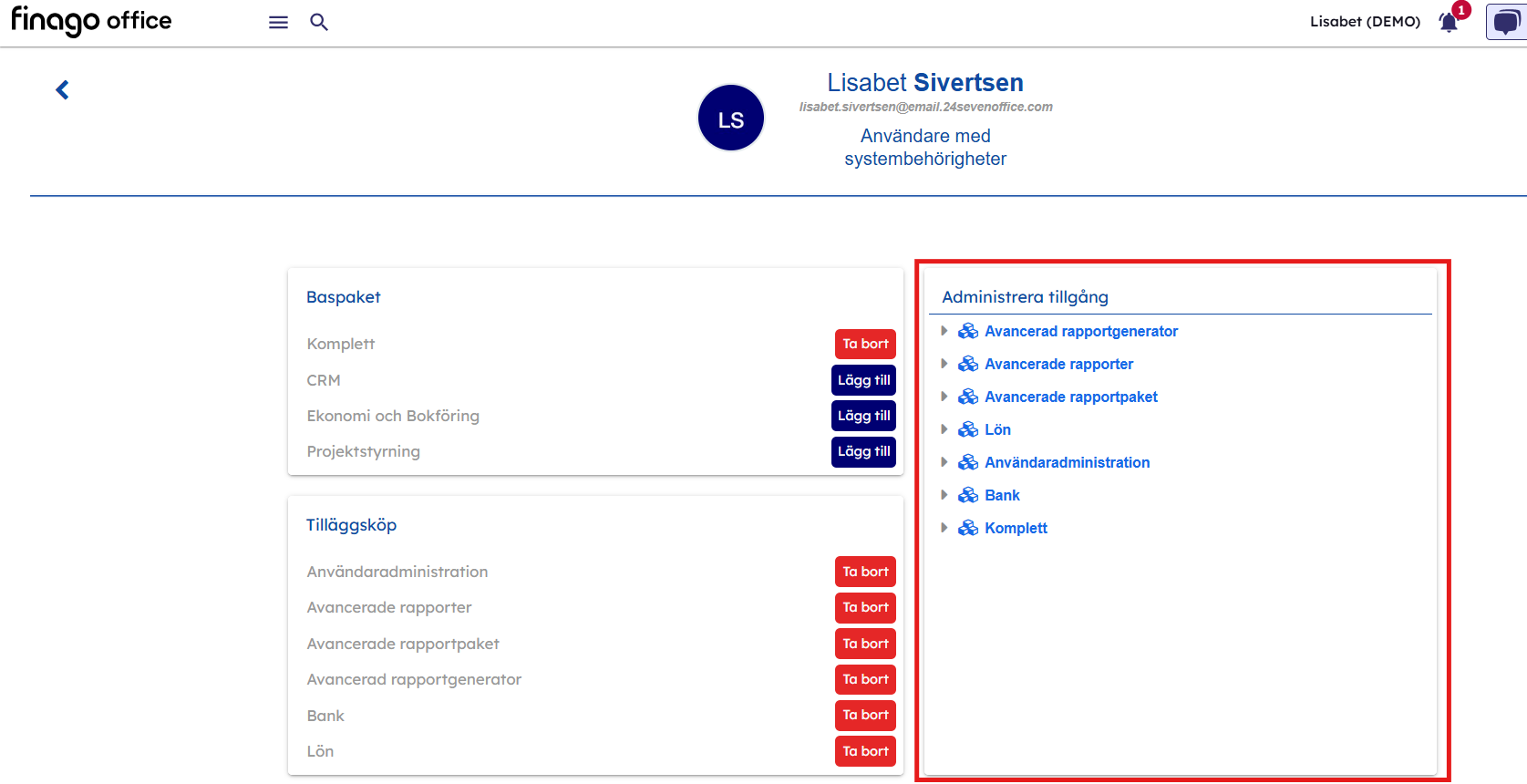 Tilläggspaket är extra behörigheter utöver huvudpaketet. I Finago Office betalar du inget extra om du justerar användartillgångar, detta gäller både huvud- och tilläggspaket.