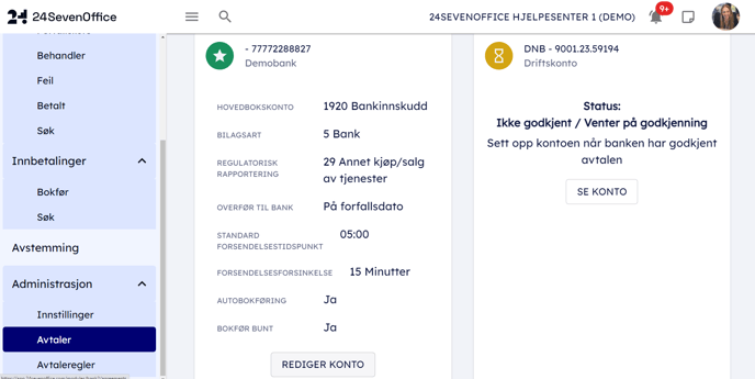 För avtal med DNB kan du enkelt efterbeställa detta i din internetbank genom att besöka följande länk: https://www.dnb.no/bedrift/dagligbank/betaling/tjenestebutikken?erp=24SevenOffice&kontoinfoval=true&innbetalingerval=true&utbetalingerval=true