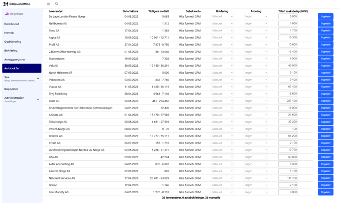 - Öppna bokföringsmodulen och navigera till Autobokför i menyn till vänster. Där hittar du en lista med fakturor där du kan ställa in regler för autobokföring. Se till att debetkonto är korrekt inställt på leverantören i CRM.